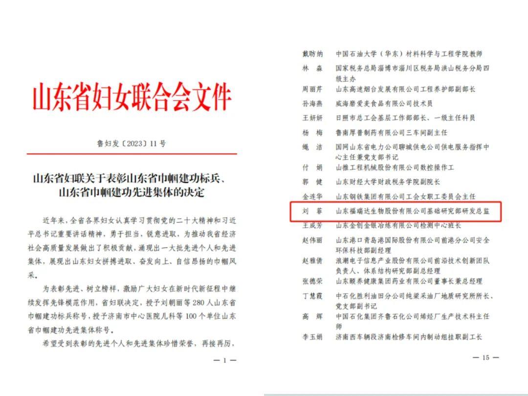 為表彰先進、樹立榜樣,激勵廣大婦女在新時代新征程中繼續發揮先鋒模范作用,近日,省婦聯發布山東省巾幗建功標兵、山東省巾幗建功先進集體表彰決定,福瑞達旗下福瑞達生物股份基礎研究部總監劉菲榮獲“山東省巾幗建功標兵”稱號。