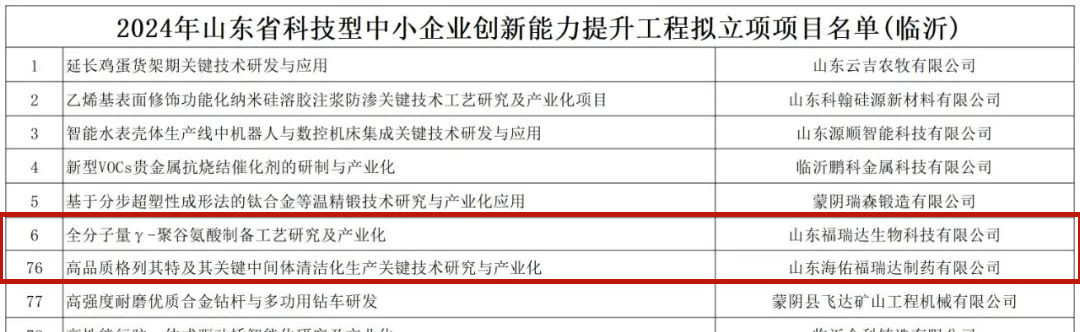 福瑞達旗下福瑞達生物科技與海佑福瑞達兩家公司申報的“全分子量γ-聚谷氨酸制備工藝研究及產(chǎn)業(yè)化”和“高品質(zhì)格列齊特及其關(guān)鍵中間體清潔化生產(chǎn)關(guān)鍵技術(shù)研究與產(chǎn)業(yè)化”兩項目成功獲得2024年省科技型中小企業(yè)創(chuàng)新能力提升工程立項,兩項目立項金額1750萬元,獎補資金近100萬元。